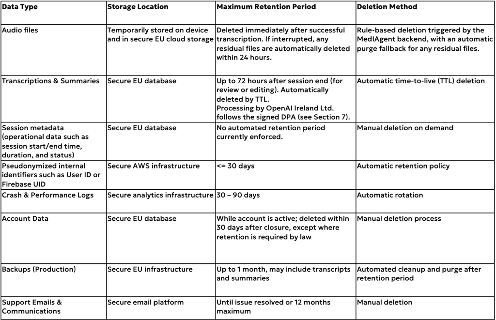 MediAgent applies strict data-retention limits across all environments to comply with the GDPR storage-limitation principle (Article 5 (1)(e)).